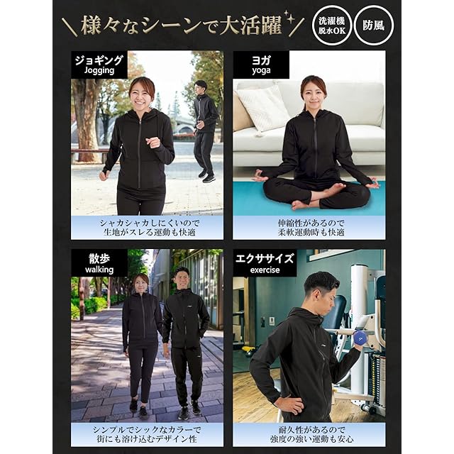 【サウナスーツ上下+オリジナルマニュアル付 身体のメカニズムを頭にインストールし最短最速理想の身体に】強力発汗を促す熱循環式サウナスーツ。男性女性それぞれの体型に合わせた特別設計。レディースはスリムなデザイン、メンズはプロ志向のゆとりあるスタイリッシュさを追求。サウナスーツには見えないからあらゆるシーンで活躍。