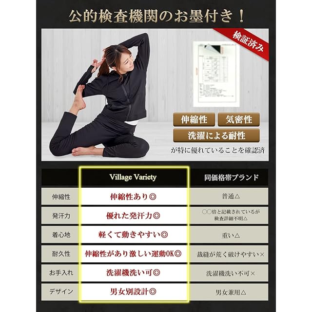 【公的検査機関のお墨付き】伸縮性、気密性、洗濯耐性が特に優れていることを確認済。洗濯機での洗濯可。シェイプアップが効率的に行われる心拍数であるファットバーンゾーンに通常衣類と比べ格段に早く到達することを確認済。