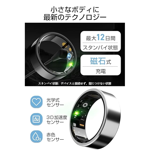 スマートリング 健康管理 【新登場 & 長時間使用可能】 Android/Iphone対応 睡眠管理 スマート指輪 ヘルスケア 睡眠計測 8種類運動モード 3種類データ測定機能 IP68防水USB磁気充電 カメラ制御 小型 超軽量 カロリー 運動距離 歩数計 活動量計 smart ring 男女兼用 日本語取扱説明書 磁気充電ケーブル付き プレゼント (シルバー, 10号(62.3mm)) | つむぎ屋