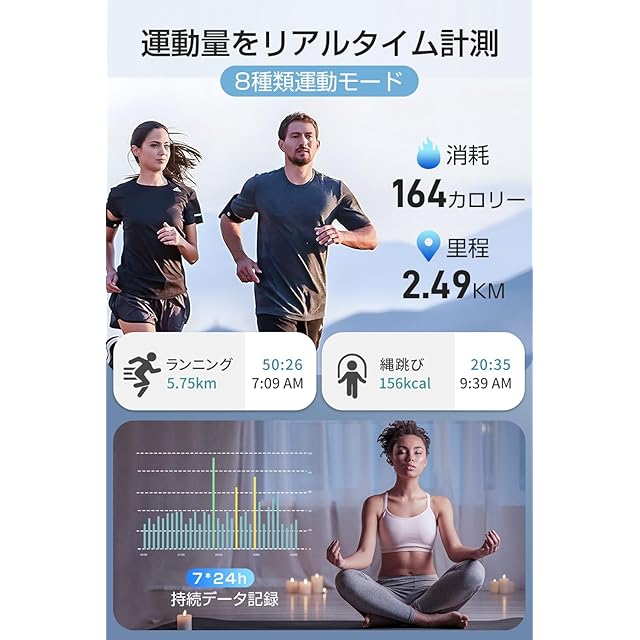 【8種類の運動モードで運動量を計測】 スマートリングはアプリを通してリアルタイムで運動量を計測でき、活動量計として使用できます。アプリにはランニング、ウォーキング、ハイキング、サイクリング、縄跳び、ダンス、ヨガ、ゴルフ 8種類の運動モードが選択可能で、運動時に精密なカロリー計算、運動距離測定、歩数計算、ペース(配速)計算などを実現します。これによって、毎回の運動の状況を把握し、運動効果を効果的に高め、運動のモチベーションを維持することができます。