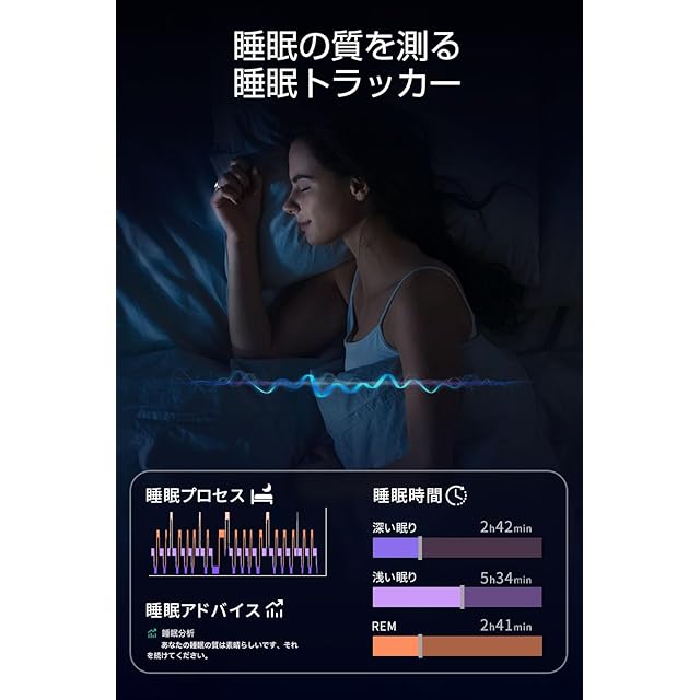 【睡眠管理と24h健康管理】 スマートリングの光学式センサー、重量センサー、赤色センサーによって、健康管理が可能です。夜間リングを付けたまま寝ると、翌日アプリより睡眠時浅睡眠、深睡眠、REM睡眠の時間帯、目覚めた回数などの睡眠の詳細が確認できます。睡眠の質評価とアドバイスも表示されます。また、他のデータも5分間ごとに精密で持続的に測定し、一日中のデータの詳細も確認でき、あなたのフィットネス目標の達成をしっかりサポートします。