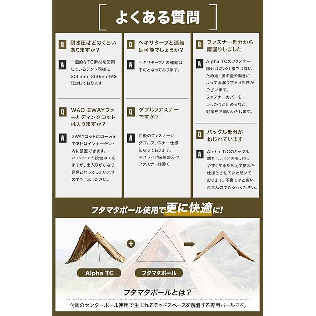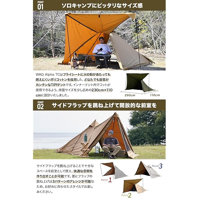 ✔【ゆったり快適な、自分だけの空間】 WAQ Alpha TCはフライシートに火の粉があたっても燃えにくいTC素材(ポリコットン)を採用した、どなたでも設営がかんたんなTIPIテントです。出入り口を前後に設けることで跳ね上げ昨日を使用しない場合でも通常のワンポールテントとして使用が可能です。 【サイドフラップを跳ね上げて、開放的な全室を。】 サイドフラップを跳ね上げることで必要十分なスペースを全室として使用でき、快適な空間を作り出すことが可能です。