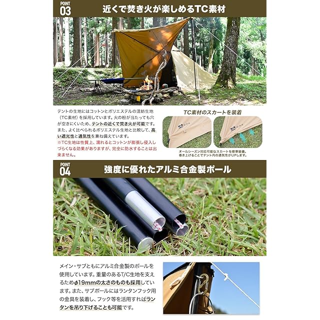 ✔【同じ素材のスカートを装着】 冬キャンプでも問題なくお使いいただけるよう、同じ素材のスカートを標準で装備いたしました。スカートはトグルボタンで巻き上げが可能で、巻き上げることでテント内の通気性が向上します。サイトやフィールドの状況に応じて使い分けてください。 【強度に優れたアルミ合金ポール】 メイン・サブポールともにアルミ合金製のポールを採用しています。重量のあるTC生地を支えるためΦ19mmの太さのものを採用しています。また、サブポールにはランタンフック用の金具を装着し、カラビナやフックを活用すればランタンを吊り下げることも可能です。