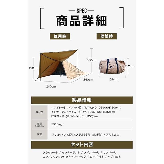 ✔【製品詳細】 ・サイズ:フライシートサイズ(外寸):(約)W240cm × D240cm × H150cm ・インナーテントサイズ:W230cm x D110cm x H135cm ・収納サイズ:(約)W57×D22×H22cm ・重量(付属品含む):(約)6.5kg ・収容可能人数1人 ・材質ポリコットン(ポリエステル65%、綿35%))、アルミ合金 ・セット内容 フライシート x 1 インナーテント x 1 メインポール x 1 サブポール x 2 コンプレッションベルト付きキャリーバッグ x 1 ロープ✕6本(4本はテントに取り付け済) ペグ✕16本