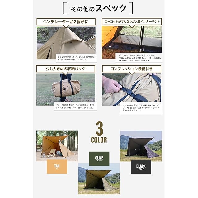 ✔【FEATURES[特徴]】 ・ベンチレータが2箇所に:テント内部に新鮮な空気が流れるよう、テント上部2箇所にベンチレーターを設置いたしました。 ・ローコットがすんなり入るインナーテント:インナーテント内でコットが使用できるよう床面サイズを少し広めの230x110cmに設計いたしました。 ※WAQ2WAYフォールディングコットが中に入ります。 ・少し大きめの収納バッグ:テントの他に必要なアイテムをまとめられるよう少し大きめの収納バッグに設計いたしました。