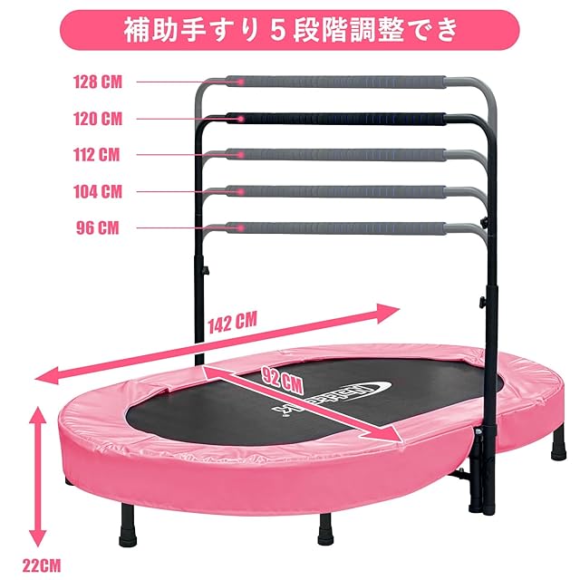 [安定性アップ、八本脚と五段階調節可能な手すり付き]: 8本脚の先に取り付けられたゴムが衝撃を吸収し、床へのダメージを軽減します。手すりを掴むことで安定し、バランスを崩すことなく飛ぶことができるので、お子さんや年配の方、トランポリンに不慣れな方にも安心して使えます。