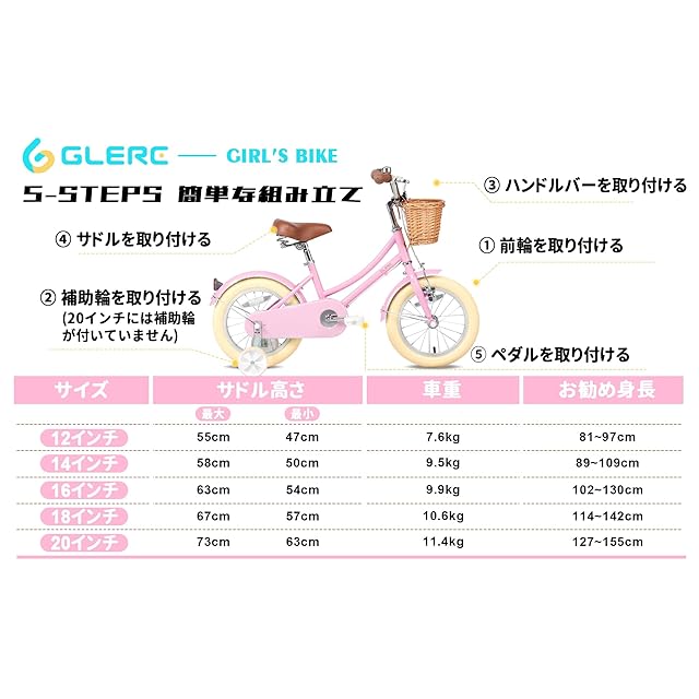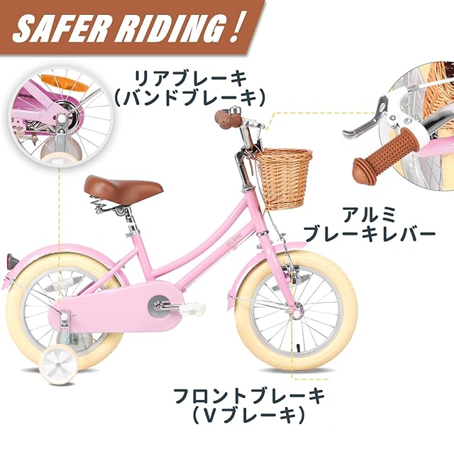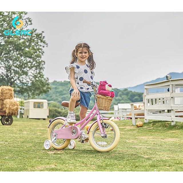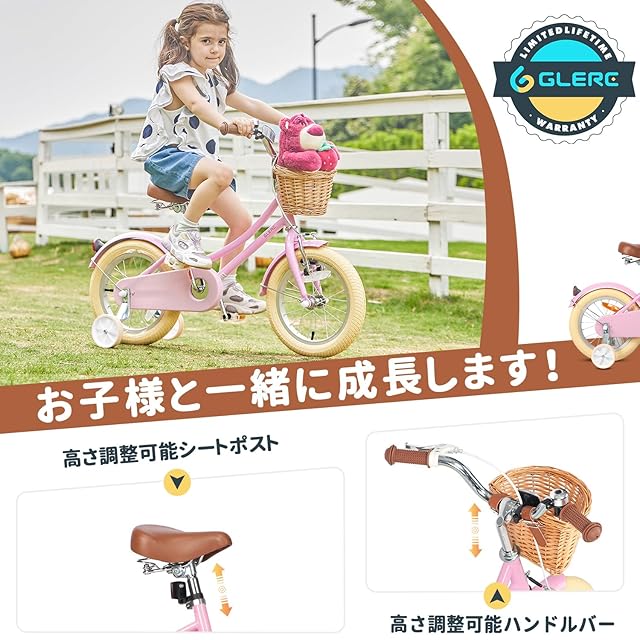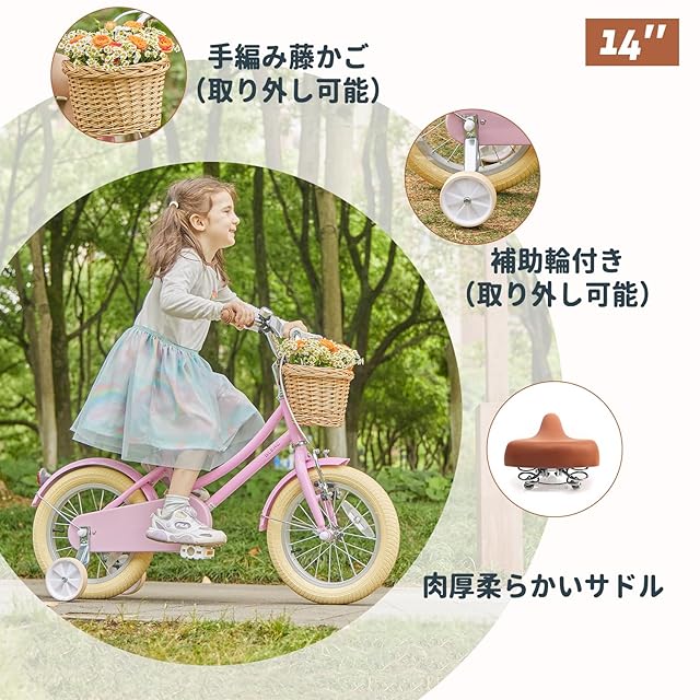 【Glerc】Little Molly 女の子子供用自転車 可愛いキッズバイク 乗り練習 低学年 幼児 貼り紙DIY 三輪自転車 柔らかいサドル 藤カゴ付き 取り外し補助輪付き 3〜5歳 レトロシンプルマカロンカラー 14インチ ピンク | つむぎ屋