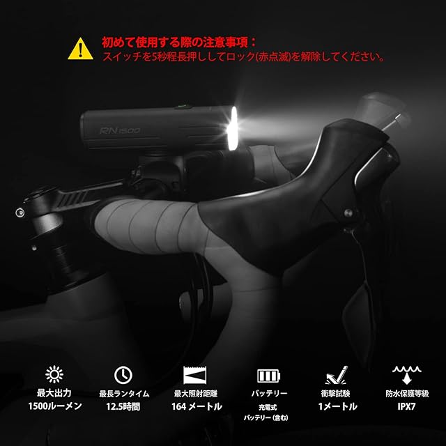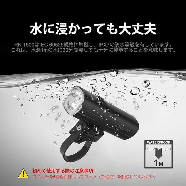 [IPX7防水] RN1500は五つのモードで切替可能で、サイクリング中に様々な照明ニーズに対応できます。IPX7防水基準に達成し、大雨や雪の日などの悪天候でも十分な視野を確保できます