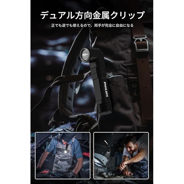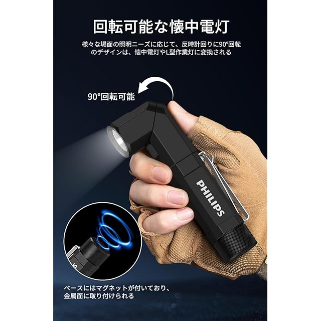 Philips(フィリップス) ledライト 小型 懐中電灯 強力 フラッシュライト 1000ルーメン 高輝度 Type-C充電式 首振り 作業灯【90°回転/18650電池交換可/クリップ付/マグネット/低電量提示】L字 L型 胸ライトSFL5806BK | つむぎ屋
