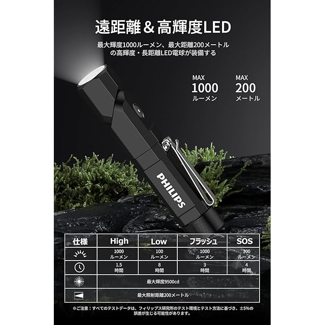 【高輝度&長距離】高性能LEDを使用し、最大輝度1000ルーメン、最大照射距離200メートルの強い光を放つことができます。暗闇でも広範囲を明るく照らします。メンテナンス、災害対応、棚卸し、旅行、ハイキングなどに最適なツールです。