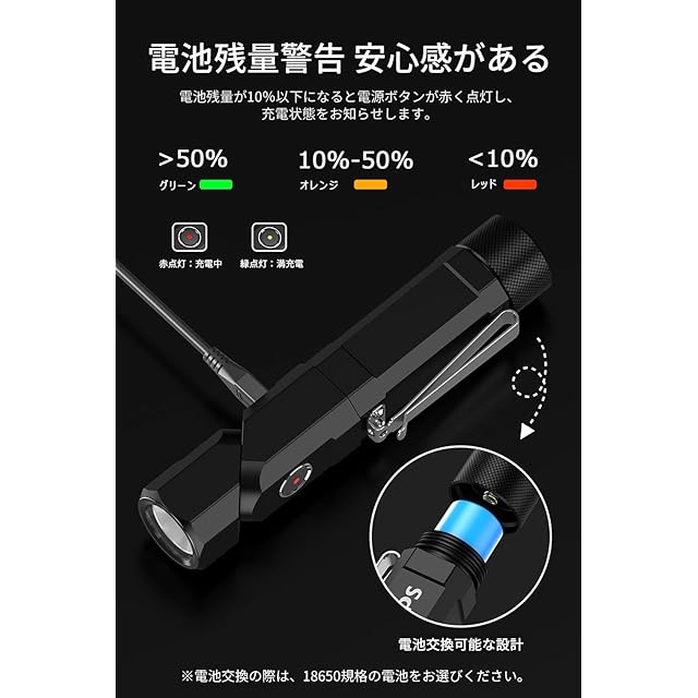 【5つ光モード切替&電池残量確認機能】弱光、強光、無段階調光、フラッシュ、SOSの5つ光モードを備えています。操作方法は、順番にクリックすると弱光モードから強光モードに切替ます。長押しで無段階調光モードになり、最小・最大の明るさに達すると、白色光が2回点滅して示すので、必要に応じて欲しい明るさを調整できます。点滅モードとSOSモードはダブルクリックで変更します。電源ボタンにはバッテリー残量を示す機能があります。電池残量が50%以上の場合は緑色、10%以上50%未満の場合はオレンジ色、10%未満の場合は赤色のランプが常時点灯しています。電池残量はいつでも確認することができます。