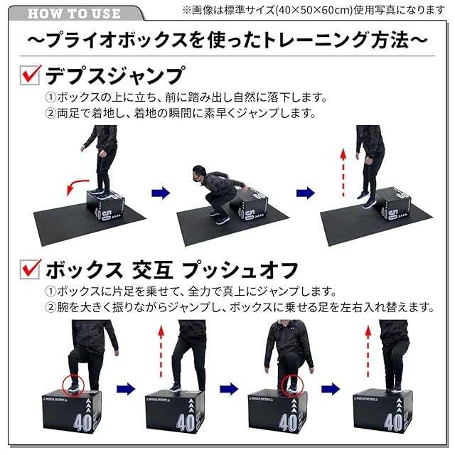【様々なトレーニングができる】下半身の瞬発力の向上が期待できるデプスジャンプ、ボックス交互プッシュオフ、サイドトゥサイドプッシュオフ、肩や胸の筋力の向上が期待できるボックスオーバーなどたくさんの運動ができます。ボックスを置く面を変えることで、高さを30*40*50cmに変更できるため、自身のレベルやトレーニングの種類に合わせた使い方ができます。