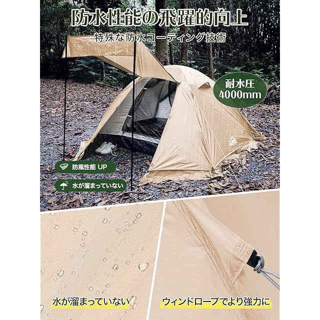 【全天候対応】このテントは耐水圧4,000mmの高密度ポリエステルタフタ生地を採用しており、PU防水シームシール加工が施されているため、突然の雨や梅雨時のジメジメした天候でも完全防備できます。特に5月の天候が崩れやすい時期や昼夜の寒暖差が激しい季節でも、四面メッシュ仕様のインナーテントが通気性を確保し、蒸れを軽減します。標準装備のインナーマットにグランドシートを追加すれば、秋冬の冷え込みもシャットアウトできる優れものです。耐水圧性能と通気性を両立したこのテントなら、季節を問わず快適なキャンプが楽しめます。