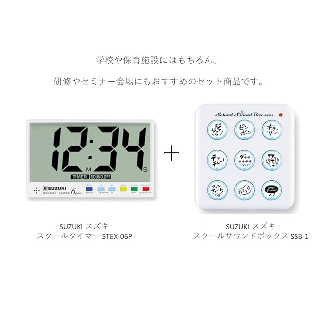 ご好評頂いているスズキの「スクールタイマーSTEX-06P」と、保育や学校生活を音で楽しく演出する「スクールサウンドボックスSSB-1」のセット商品です。学校の教室や、講演会・セミナー・研修などのイベント会場に1台「あったら便利」な商品をセットにしました。