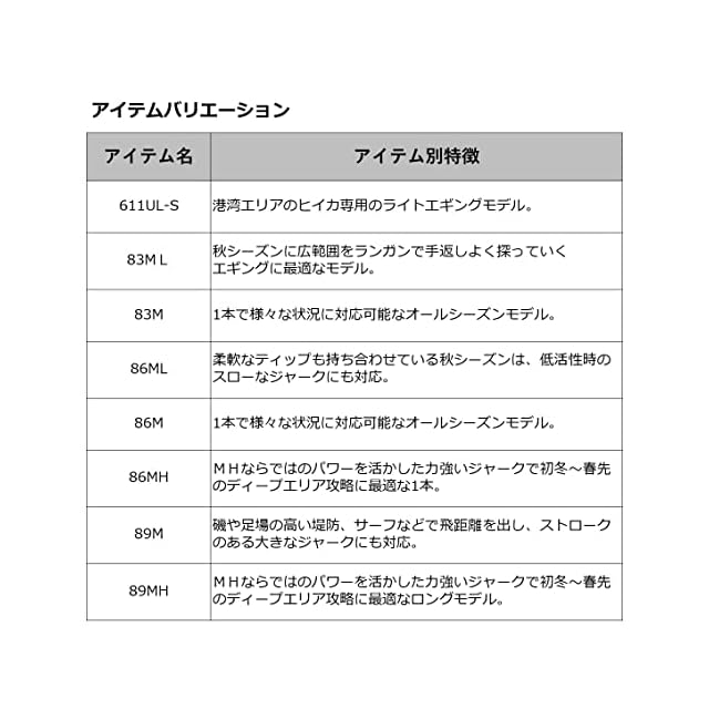 83ML:操作性・軽快さを重視したレングスで、1.8号~3.5号までのエギに対応。秋シーズンに広範囲をランガンで手返しよく探っていくエギングに最適なモデル。バット部はX状にカーボンテープで締め上げた「ブレーディングX」を採用し、軽快なキャスト、シャクリといったエギングロッドの基本性能をしっかりカバーしたモデル。