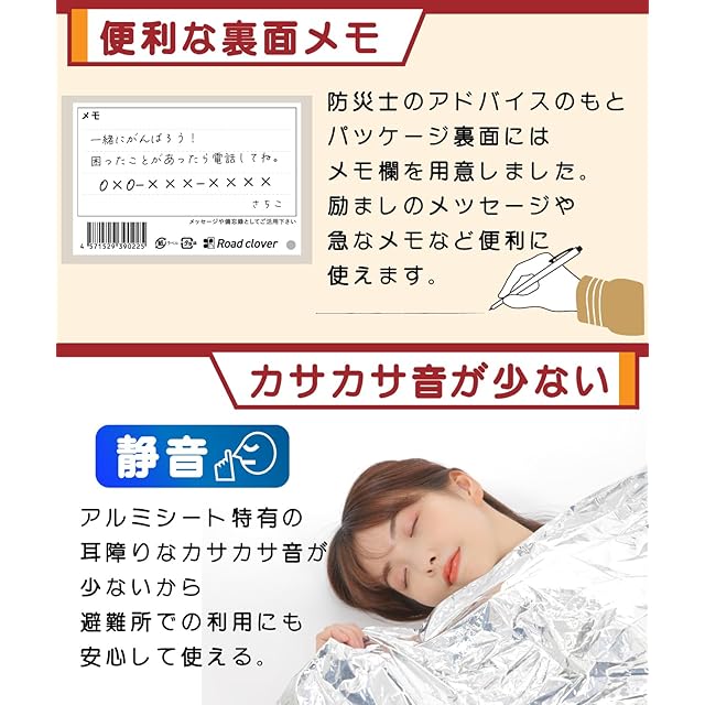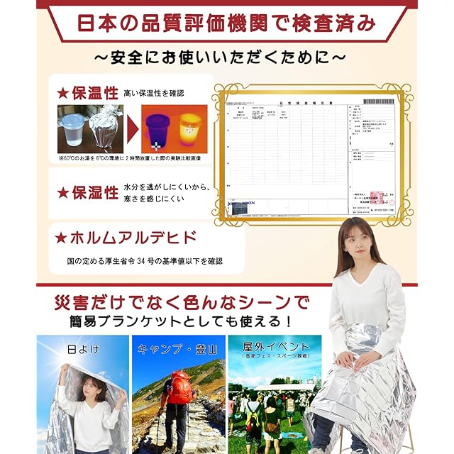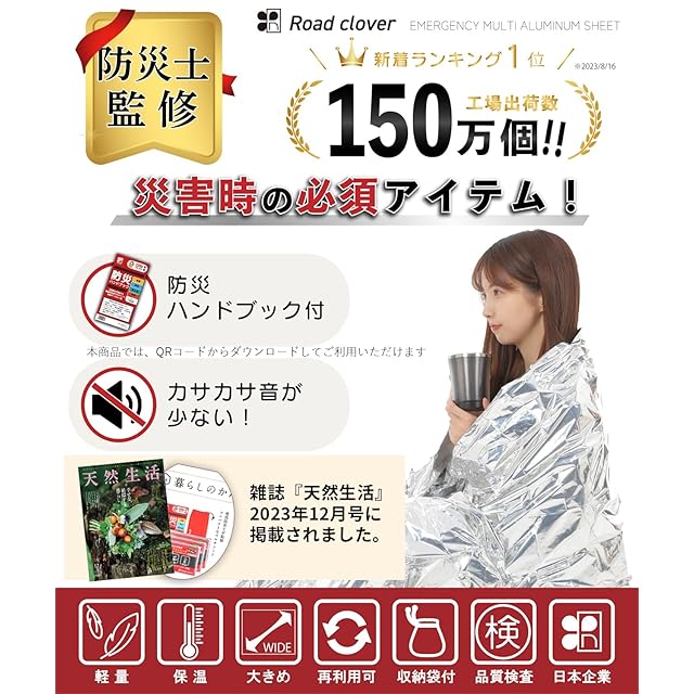 ✅このマルチアルミシート(サバイバルシート)は、現役防災士の監修により開発されました。防災ハンドブックが付属しており、災害対策から被災後の生活支援に至るまで、防災グッズとしても広範な知識が提供されています。また、専用の収納袋が付属し、さらにパッケージにメモ領域が設けられているなど、防災士による経験豊かな智恵が活かされています。