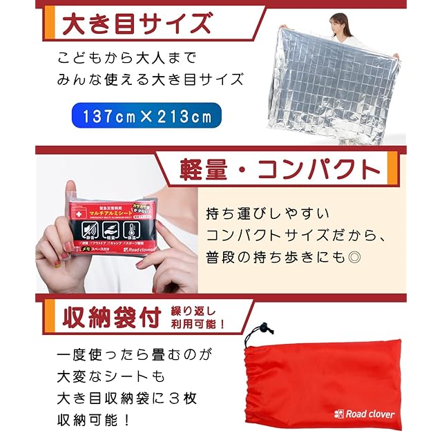 緊急時の暑さ・寒さ対策用の簡易ブランケットとして、災害グッズ、直射日光の日よけ、キャンプ、登山、スポーツ観戦、音楽フェス、食品デリバリー配達の保温シートなどにもご利用いただけます。アルミシート(サバイバルシート)使用後は、水分や汚れ、ほこりを取り除き、付属の収納袋に入れ、乾燥した場所で保管することで、長期間にわたり繰り返し使用することができます。