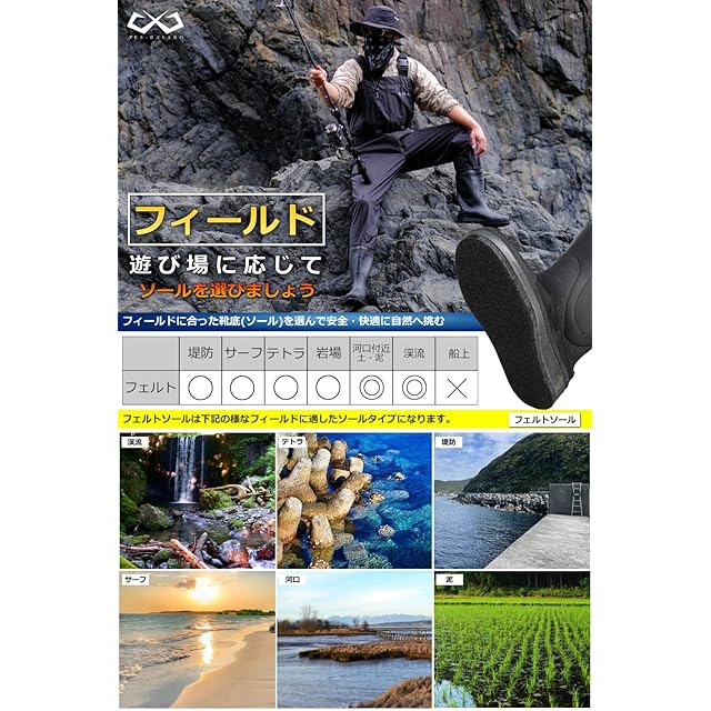 ご自身が着用するフィールドの状態に合わせたソール選びが必ず必要です。ラジアルソール:堤防・サーフ・河口・泥・土・船上が得意なフィールドとなります。ラジアルソールは基本的に一般的なシューズの靴底になっているタイプです。フェルトソール:渓流・テトラ・サーフ・岩場・河口・土・泥が得意なフィールドになっております。フェルトソールはオールマイティにフィールドに適応している為、様々なフィールドにでる場合はフェルトソールがお勧めです。