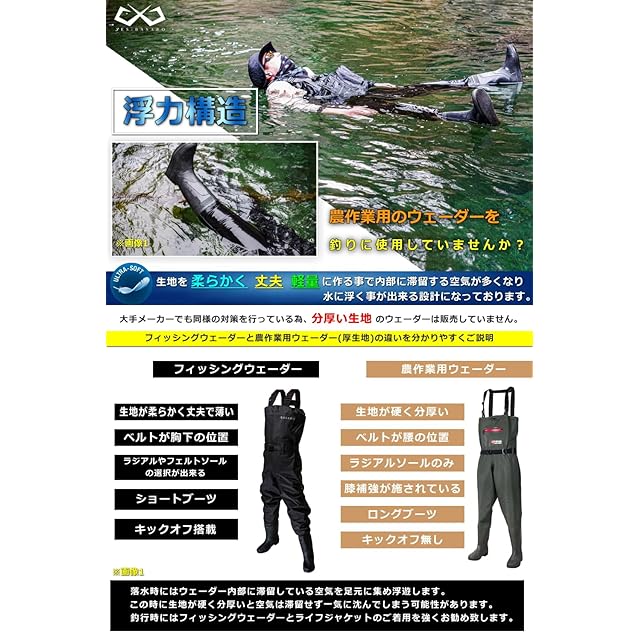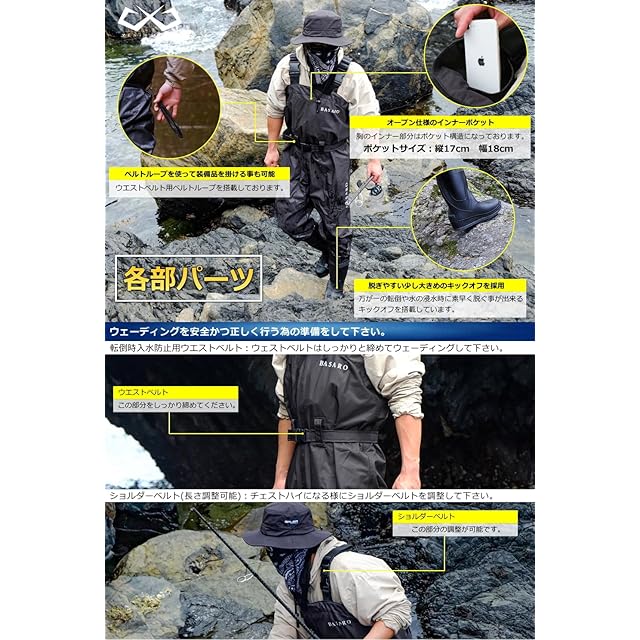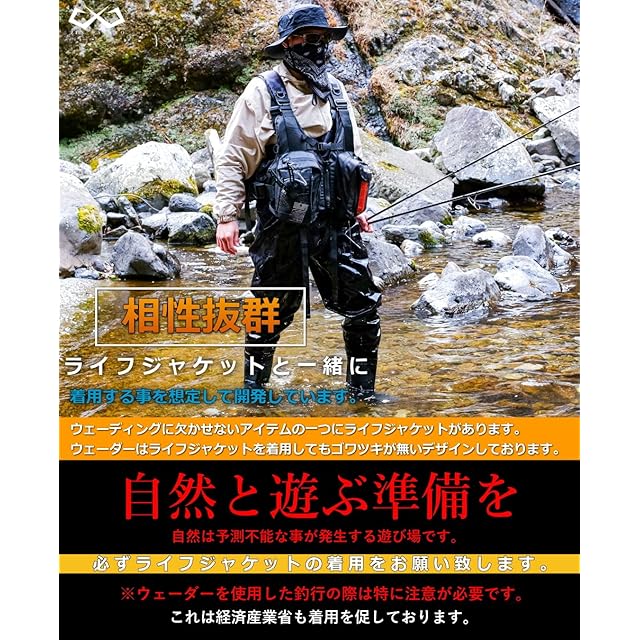 ご使用上の注意点:ウェーダーはあくまでも防水ツールとしお考え下さい。チェストハイウェーダーを着用し無理に深みに入って行かない様にしてください。またウェーダーを着用する際は必ずライフジャケットも同じく着用して下さい。万が一の転倒でウェーダー内部に大量の水が入ると自力では起き上がることが非常に困難です。フィールドタイプを考えてソール選びをし、安全に楽しくウェーディングして下さい。
