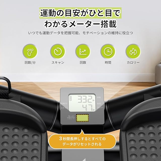 【運動量の調整と確認も可能!】ツイストステッパーの調整ノブを回すだけでステップの高さを変更でき、自分にあわせた運動量の調整が可能です。角度を小さくすることで体への負荷が減るため、初心者でも長時間の有酸素運動を無理なく行えるでしょう。また、ステップ回数や運動時間、消費カロリーも備え付け多機能モニターが搭載されています。トレーニングの時、情報をリアルタイムで確認することができ、トレーニングのモチベーションを高めます。ご注意:表示メーターがカウンターできない場合は、調整ノブをネジ山全長の2/3程度まで締めてください。