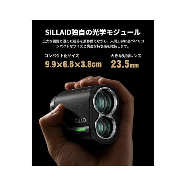 【SILLAID独自の光学モジュール】広大な視野と握りやすいサイズ感を両立させるために、SILLADは製品の品質と快適な操作を高めることに注力しており、最新の技術とデザインを駆使して独自の光学モジュールを開発しました。優れた光学性能を提供しながら、サイズは大きすぎなく男性の手にも女性の手にも優しいです。親指が当たる部分に滑り止めが仕上げる上、より繊細な感触を持つ耐摩耗性に優れた多層塗装UVを施したなど細部までこだわりを詰め込みました。全てのゴルフ愛