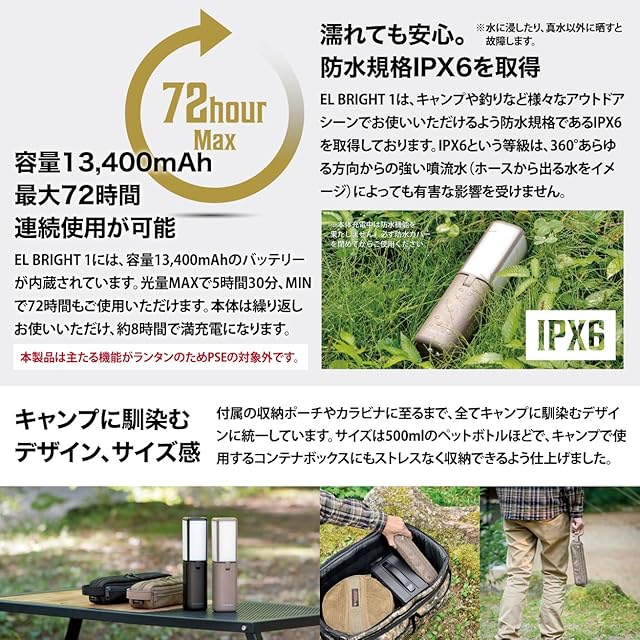 【最大72時間 連続使用が可能】内蔵バッテリーは13,400mAhと大容量。連続使用時間は光量MAXで5時間半、弱だと最大で72時間もご利用いただけます。LEDランタン本体はUSB充電式を採用しており、最大8時間で満充電になります。※本製品は、主たる機能がランタンであるため、PSEの対象外となります。