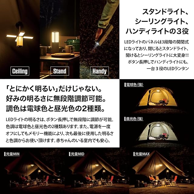 【一台3役】LEDライトのパネルは3段階の開閉式で閉じるとスタンドライト、開けるとシーリングライト、更に操作ボタンを長押しするとハンディライトに大変身。操作も簡単ですので、用途に合わせて使い分けていただけます。