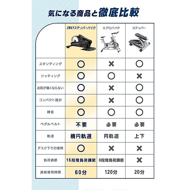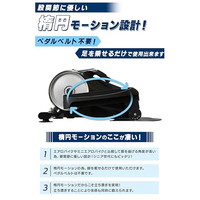 【楕円モーション】2WAYステッパーバイクは楕円上に足を動かすため、膝関節や股関節の可動域が少なく、関節に優しい運動器具です。