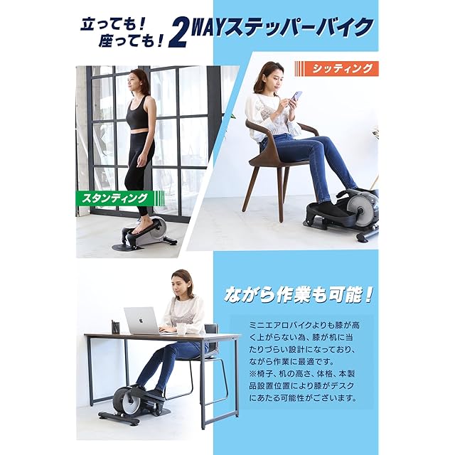 【立・座の2WAY】立ち漕ぎも、座って漕ぐことも可能な2WAY仕様となっております。立ちこぎをすることにより体感を使いながら有酸素運動が出来ます。付属パッドをペダルに載せることで裸足でも使用可能となり、いつでもお気軽にご使用いただけます。