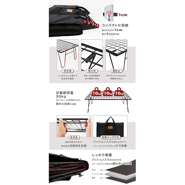 ★マルチに使えて高コスパ!激売れ中のフィールドラック。 ★収納も簡単でかさばらないフィールドラックはキャンプで意外と大活躍! ★復数を重ねたり並べたりするなど、色々な使い方ができるラックです。 【キャンプで大活躍】 キャンパーの間では、道具や材料を整理しておいたり、テーブル代わりに使用するなど、機能的で収納もコンパクトな人気のおすすめ製品です。 【コンパクトに収納】 フィールドラックがおすすめなのはその収納の良さです。足をたたむとほんとに薄い一枚の板の大きさになります。車の空きスペースに複数枚収納しておくことができます。 【耐荷重30kg】 耐久性や見た目が良いだけではなく、太い針金の使用により頑丈に出来ています。20kgの重いウォータージャグやクーラーボックスでも問題なく置けます。安定性アップの為、脚部を通常品より太くしております。 【収納袋付き】 傷や緩みに強い900Dポリエステル製、小物入れや生地の厚めの設計になっております。厚めのクッション入りで、フィールドラックをしっかり守ります。とても便利で長く使えます。