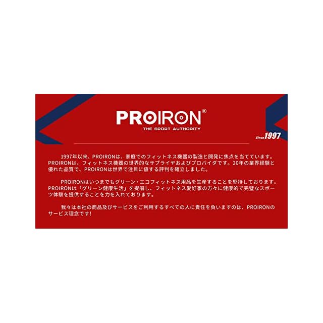 【20年以上の鋳鉄の経験で】1997年以来、PROIRONは、家庭でのフィットネス機器の製造と開発に焦点を当てています。 PROIRONは、フィットネス機器の世界的なサプライヤおよびプロバイダです。 20年の業界経験と優れた品質で、PROIRONは世界で注目に値する評判を確立しました。 PROIRONはいつまでもグリーン・エコフィットネス用品を生産することを堅持しております。 PROIRONは「グリーン健康生活」を提唱し、フィットネス愛好家の方々に健康的で完璧なスポーツ体験を提供することを力を入れております。我々は本社の商品及びサービスをご利用するすべての人に責任を負いますのは、PROIRONのサービス理念です!