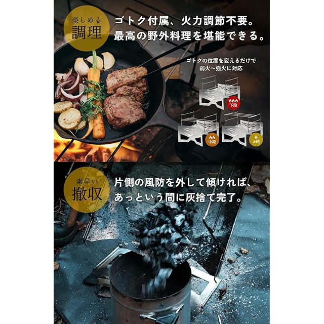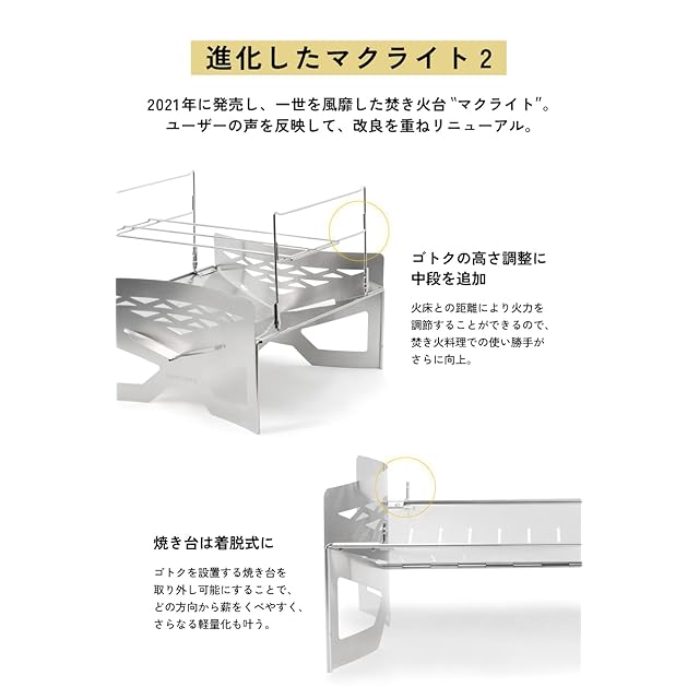 【焼き台のメリットで快適な焚き火】マクライト2の焼き台は、調理の有無や軽量化を考慮して着脱が可能。さらに、五徳の高さを3段階に変更できるため、火力の調整が不要です。これにより、調理時の面倒な火力調整をすることなく、快適に焚き火や調理を楽しめます。