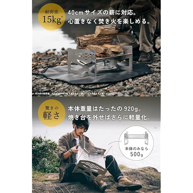 TOKYO CRAFTS(東京クラフト)マクライト2は、わずか794gの超軽量設計で、持ち運びに優れたスリムな焚き火台です。収納時サイズは約30×20×4cmとコンパクトに折りたたむことができ、バックパックにも収まりやすく、ソロキャンプやツーリングにも最適です。また、市販の40cmの薪をそのまま使用可能な大型設計なので、薪割りの手間なくすぐに焚き火ができます。組み立てはシンプルな構造でわずか数十秒で完了。五徳は3段階に高さ調整可能で、火力の調整が不要。焼き台は着脱可能なため、調理をしないときやさらに軽量コンパクトにしたい場合に便利です。使い勝手の良さを追求し、ソロキャンプはもちろん、ファミリーキャンプにも対応できる設計となっています。焚き火をより安全に楽しむために、焚き火シートの併用おすすめです。焚き火シートは80cm×80cmの大判サイズで、火の粉や灰の飛散を防ぎ、テントサイトを保護します。さらに、シートは薪バッグとしても使用可能で、薪や焚き火道具をまとめて持ち運べるだけでなく、後片付けもスムーズに行えます。セットなら、届いたその日からすぐに焚き火が可能。マクライト2の折りたたみ機能による携帯性と使いやすさに加え、焚き火シートを併用することで安全性と利便性がさらに向上します。すぐに焚き火を始めたい方や、安心してキャンプを楽しみたい方に最適なセットです。