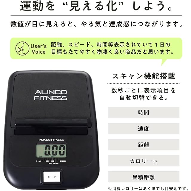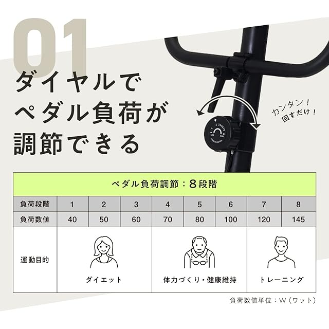 【本体仕様】本体サイズ:W500×D870×H1,055mm/本体重量:約16㎏/サドル調節:L605~H830 mm(9段階)/負荷方式:マグネット負荷方式8段階/材質:スチール、ABS、PP、PVC、PU/電源:単3乾電池×2本/連続使用時間:約30分/耐荷重:120㎏/適応身長:約150-180㎝
