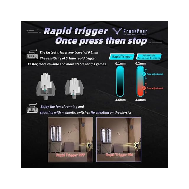 ラピッドトリガー - 一度押すとトリガーされ、離すとリセットされます。感度範囲は0.1-3.6mmです。プレイヤーは自分のニーズに応じて自由にカスタマイズできます。FPSやリズムなどのゲームでは、ラピッドトリガーが従来のキーボードよりも速いレスポンスを提供します。