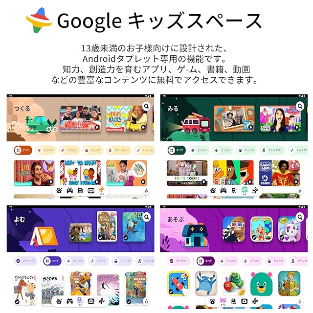 (保護者制限 搭載)スマートフォンやパソコン・タブレットから、お子様が使っているコンテンツ内容や利用時間を離れたところからでも簡単に確認できます。 子どもの成長や興味が分かって新たな発見もOKです。年齢フィルターを使用すれば、お子様の年齢に合った適切なコンテンツが自動表示。年齢フィルターはいつでも変更できるので、進級のタイミングなど、お子様の成長に合わせて長く楽しむことができます。1日の利用時間を15分単位で設定可能。使いすぎが防げるから安心してお子様に渡せます。Go0gle Playのご利用に際し、ログインが必要となっておりますので、何卒ご留意くださいますようお願い申し上げます。また、お子様向けコンテンツの適正な管理を確保するため、公式アプリストアからのダウンロードを推奨させていただいております。ご不明な点等ございましたら、どうぞお気軽に日本語カスタマーサポートまでお問い合わせくださいませ。