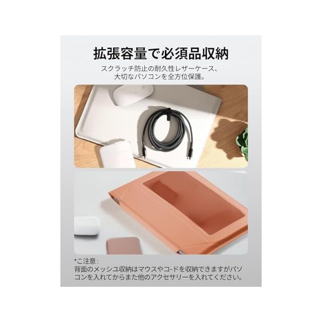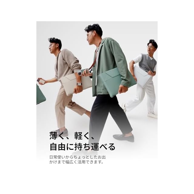 【特製の上質ヴィーガンレザー】従来のレザーに比べ約30%薄く、繊細な質感が特長です。耐久性にも優れ、温かく柔らかな手触りで、快適な持ち運びを実現します。さらに、撥水機能により、突然の雨や飲みこぼしから大切なノートPCを守ります。(本製品は完全防水ではありません。液体に浸したり、開口部から水分が浸入したりする状況には対応しておりませんので、ご注意ください。)