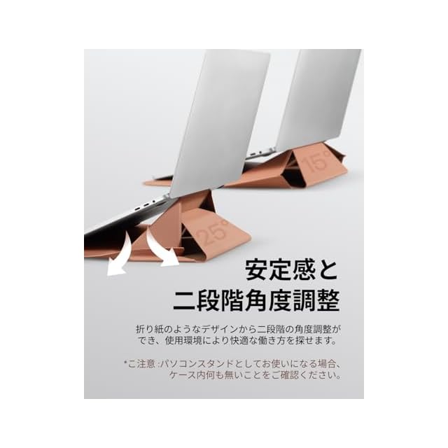 【1秒でPCスタンドに】MOFTスリーブケースは、収納・保護機能に加え、スタンドとしても活用できます。わずか7mmの薄さながら、15°と25°という2段階の角度調整が可能です。デスクワークはもちろん、膝上での作業など、どんな姿勢でもより快適な使い心地を提供します。