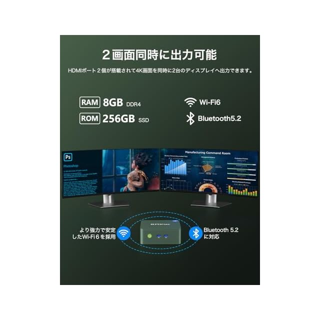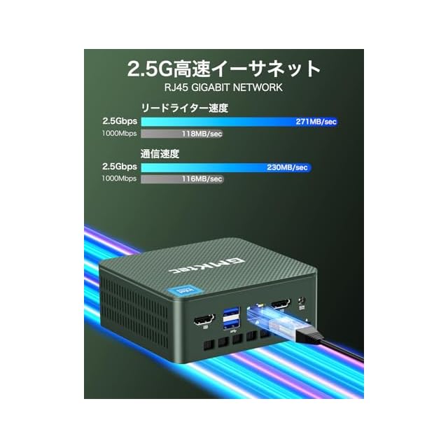 【Wi-Fi 6 & 2.5G有線LANによる安定した接続】GMKtec 小型パソコンWi-Fi 6対応により、従来よりも約3倍高速な通信を実現。さらに、2.5G有線LANポートを搭載しており、高速で安定したインターネット接続を提供します。大容量データ転送や低遅延が求められる作業もスムーズに行えます。また、Bluetooth 5.2に対応し、複数のデバイスを同時接続可能です。