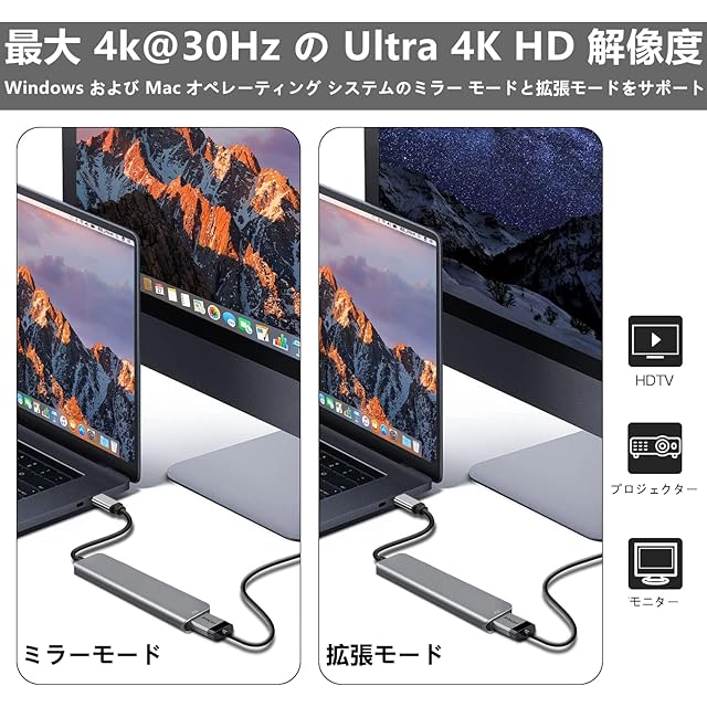 『4K高画質・PD急速充電』:HDMIポートの最大解像度は4k @(3840x2160p)30hz、最大4k超高解像度(3840x2160 30Hz)で、HDMI接続を介してテレビ、モニター、プロジェクターでビデオを再生したり、公共のプロジェクターで会議を開いたりできます。 高解像度の画面で高品質の映画や作品などをお楽しみいただけます。 また、PD急速充電ポートは、通常のType-Cデバイスと接続しても安定したUSB 2.0通信を可能にします。最大100Wの急速充電が可能なPD急速充電ポートを搭載しているため、電力不足を心配することなく充電しながら作業ができます。