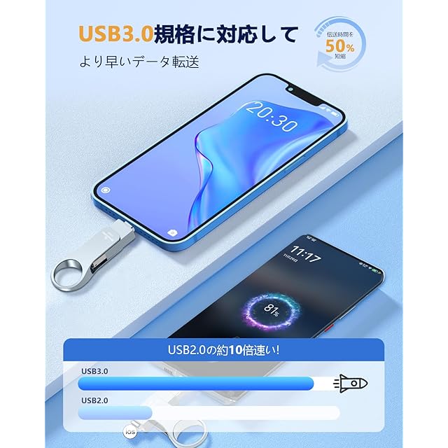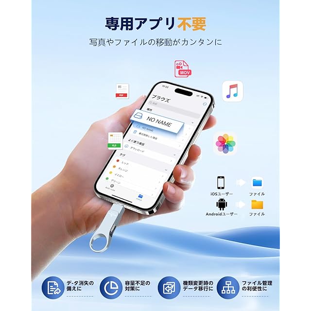 【従来品への飛躍!専用アプリ不要・多機能実現】最新技術で開発したUSBメモリでアプリなど面倒な設定は一切無し、iOS システムに付属のファイル アプリを使用して、挿せば直ぐに使用可能。写真、動画、音楽はもちろん、ExcelやPDFなどの書類データも転送可能、機器の操作が苦手な方でも簡単にデータ移動ができます。スタイリッシュなデザインに加え、便利な機能が満載のスマホ USBメモリーは、スマホと接続すると、音楽再生・写真バックアップ、ファイル圧縮・解凍、動画/画像/資料編集などの機能を果たすことができます。仕事を効率化して、日常生活をより便利にしてくれます。