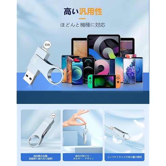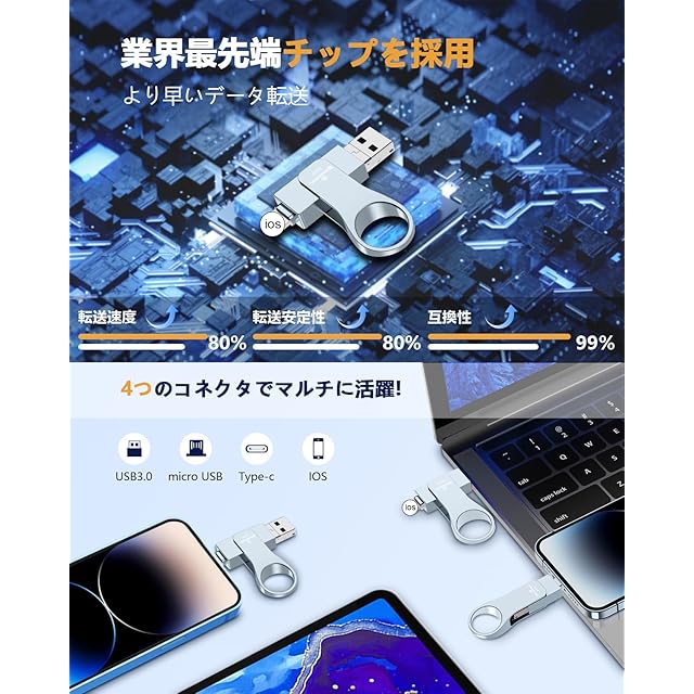 【一本四役・高速データ転送】フラッシュドライブはiOS、Type-C、USB、Micro USBの四つのコネクタを搭載でこの一本で全てのIOS、Windows PC、Typec、Micro USBのAndroid設備にスライドで対応しています。デバイスごとに対応した製品を複数購入する問題を解決します。各機種の間に写真やビデオなどのファイルを自由に共有できます。高品質なチップを採用しており、安定性が飛躍的に向上され、高速なデータ伝送を実現します。ネット環境がなくても気になる大量に溜まっている写真や動画データを簡単にバックアップできるので、端末の容量不足も解消できます!Phone写真バックアップにより、高額なクラウド サービスの月額料金を節約するのに役立ちます。