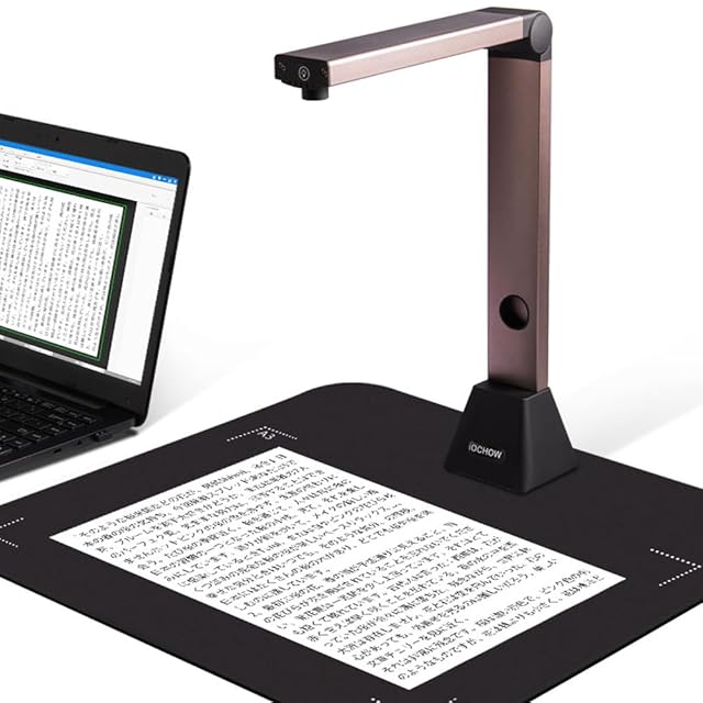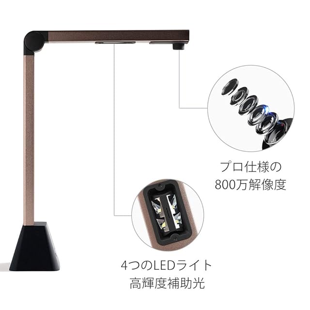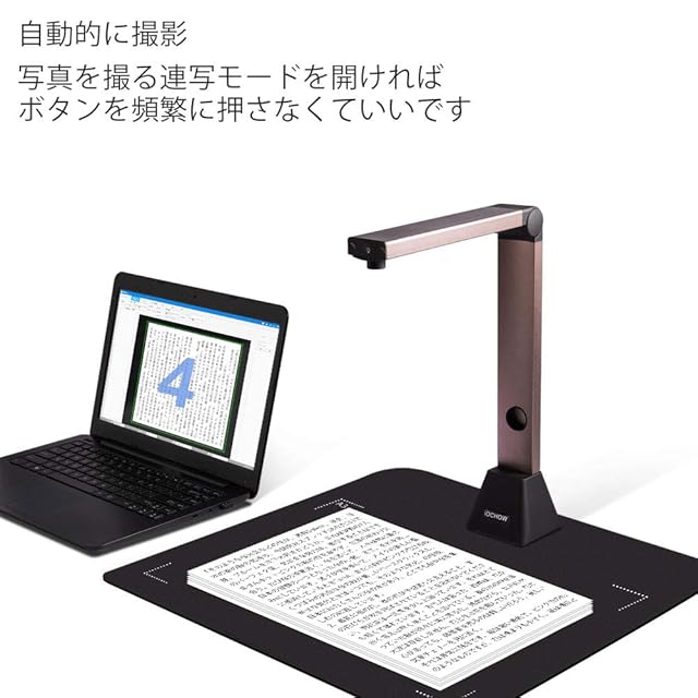 【高速スキャン】800万解像度、最大A3サイズまでのスキャンに対応しており、ドキュメントを全体的にクリアにスキャン可能です。スペースの限られた場所でも快適にスキャンできます。また、4つのLEDライト付き、暗い部屋で撮影時の補助光源として使用できます。こちらの機種には外部シャッターボタンがついていません。使用前に取扱説明書ご参考ください。
