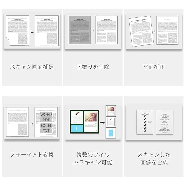 【強力な機能】自動トリミングで画像中からスキャン対象以外の不要部分を削除します。書籍スキャンモードで、自動平坦化技術による見開きページの湾曲を補正し、ページを指で押さえた際に画像中から指を削除します。また、OCR技術で、スキャンしたページをWord/Excel/PDF/TXTに簡単に変換できます。