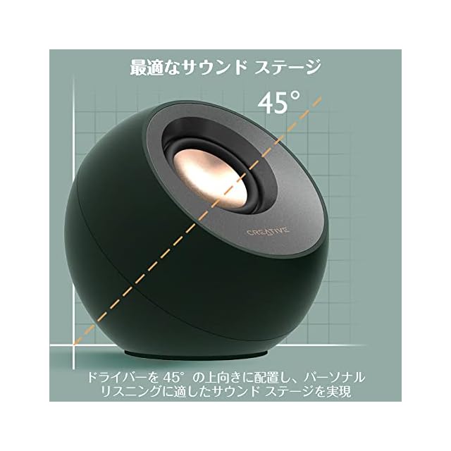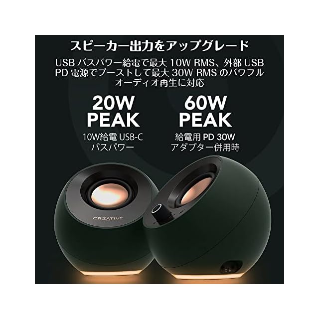 USBバスパワー給電で最大10W RMS/ピーク出力20Wのスピーカー出力を可能とするUSBオーディオ ポートに加え、新たに給電専用のUSB PDポートを搭載。USBバスパワーでは不足しがちなスピーカー出力を外部USB PD電源でブーストし、最大30W RMS/ピーク出力60Wのパワフル オーディオで再生が可能 (注:給電専用のUSB PDポートは電力専用です。PCとつないでもUSBオーディオとしては使えません) また、Pebble Proのために新開発されたデジタル アンプと、再設計によって一新した2.25インチ フルレンジ ドライバーを採用、幅広い音量レンジで深みのある低音とクリアーな高音質オーディオを実現