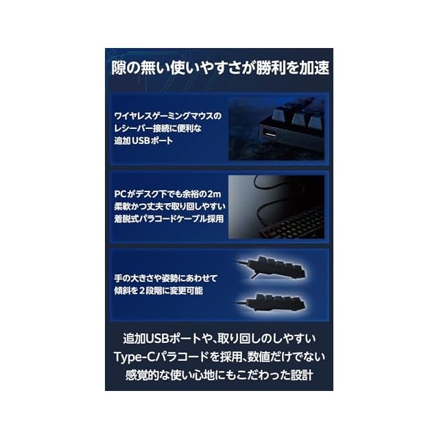 キー入力における応答速度(Speed)、精度(Precision)、安定性(Stability)を高めたエレコムのゲーミングキーボード用エンジンに、可変型のアクチュエーションポイント・リセットポイント制御システムを追加した“ELECOM Magnetic S.P.S Engine”を搭載しています。