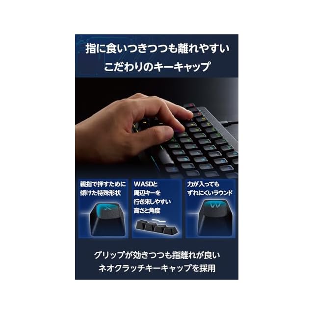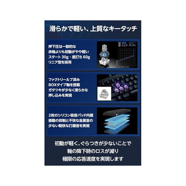 最短0.1mmの押し込み・押し上げでキー入力のON/OFF操作ができる、磁気式アナログ検知スイッチ(磁気スイッチ)搭載の65%サイズゲーミングキーボードです。