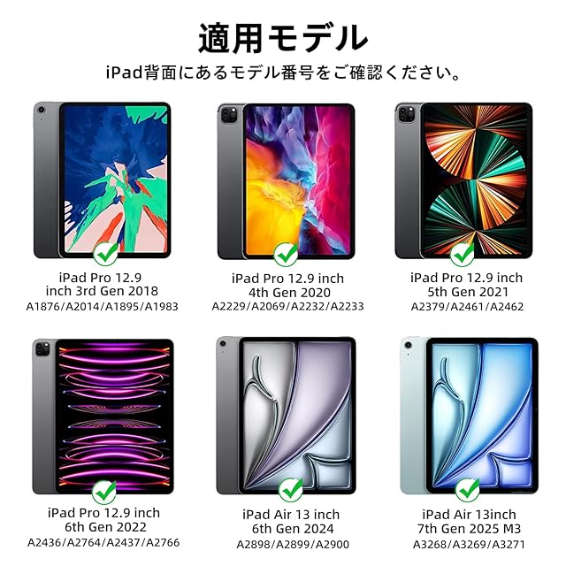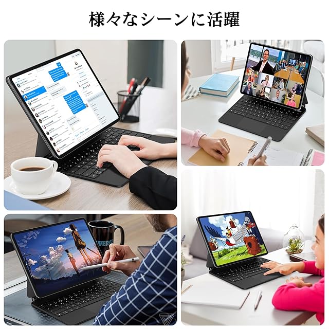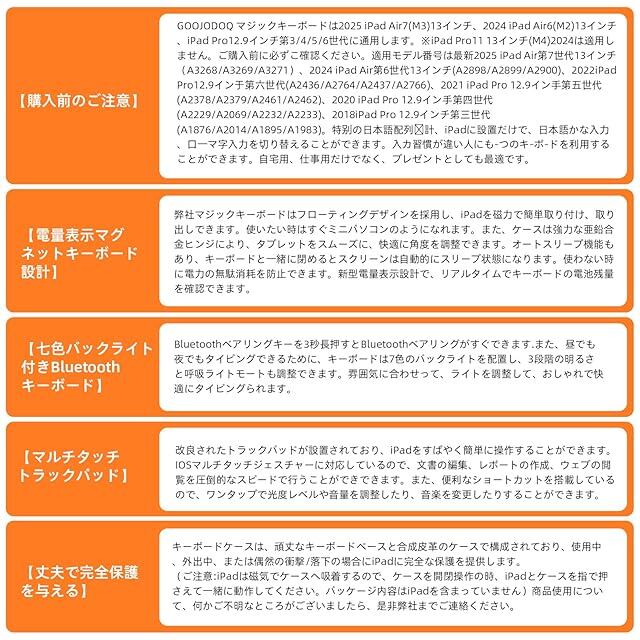 【購入前のご注意】GOOJODOQ マジックキーボードは2024 iPad Air6(M2) 13インチ、iPad Pro12.9インチ第3/4/5/6世代に通用します。※iPad Pro11 13インチ(M4)2024は適用しません。ご購入前に必ずご確認ください。適用モデル番号は最新2024 iPad Air第6世代13インチ(A2903/A2898)、2022 iPad Pro12.9インチ第六世代(A2436/A2764/A2437/A2766)、2021 iPad Pro 12.9インチ第五世代(A2378/A2379/A2461/A2462)、2020 iPad Pro 12.9インチ第四世代(A2229/A2069/A2232/A2233)、2018 iPad Pro 12.9インチ第三世代(A1876/A2014/A1895/A1983)。特別の日本語配列設計、iPadに設置だけで、日本語かな入力、ローマ字入力を切り替えることができます。入力習慣が違い人にも一つのキーボードを利用することができます。自宅用、仕事用だけでなく、プレゼントとしても最適です。