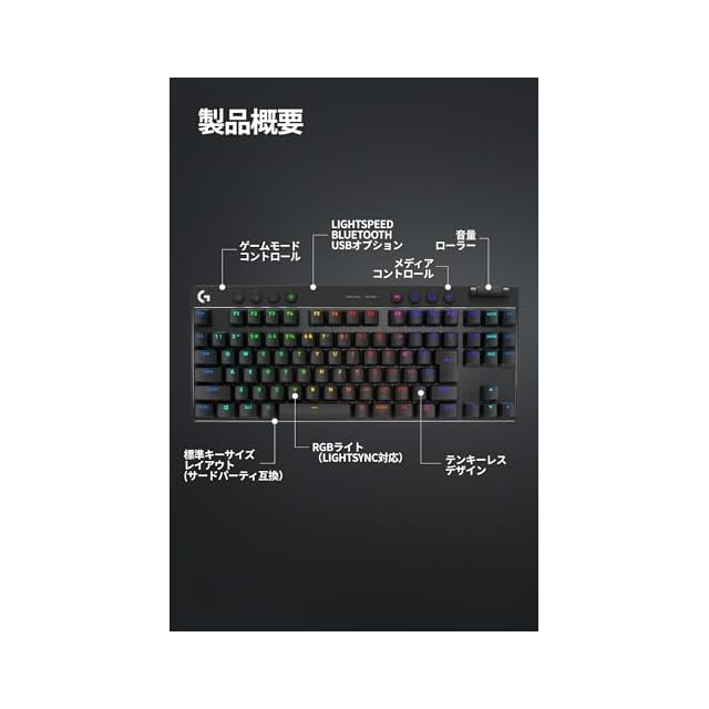 【プログレードテクノロジー】ゲームモードコントロール、標準キーボードレイアウト、メディアコントロールと音量ローラー、RGBライト(LIGHTSYNC対応)、LIGHTSPEED、Bluetooth、およびUSBオプションを備えています。