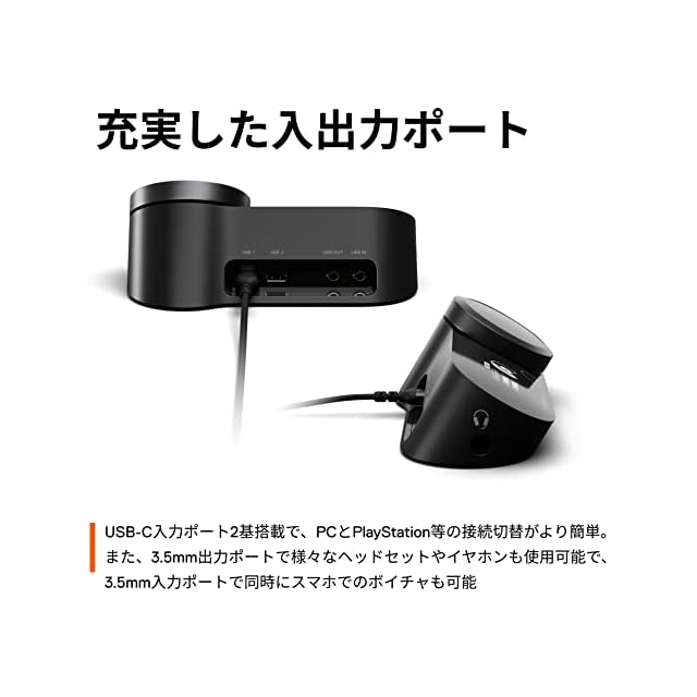 【充実した入出力ポート】USB-Cの入力ポートを2基搭載、PCとPlayStation等双方を接続し簡単に切り替えが可能。また、3.5mmジャック出力を採用しており様々なヘッドセットやイヤホンでご使用いただけます。さらに3.5mmジャック入力ポート(ラインイン)を備えているため、スマホをつないでボイスチャットもできます。